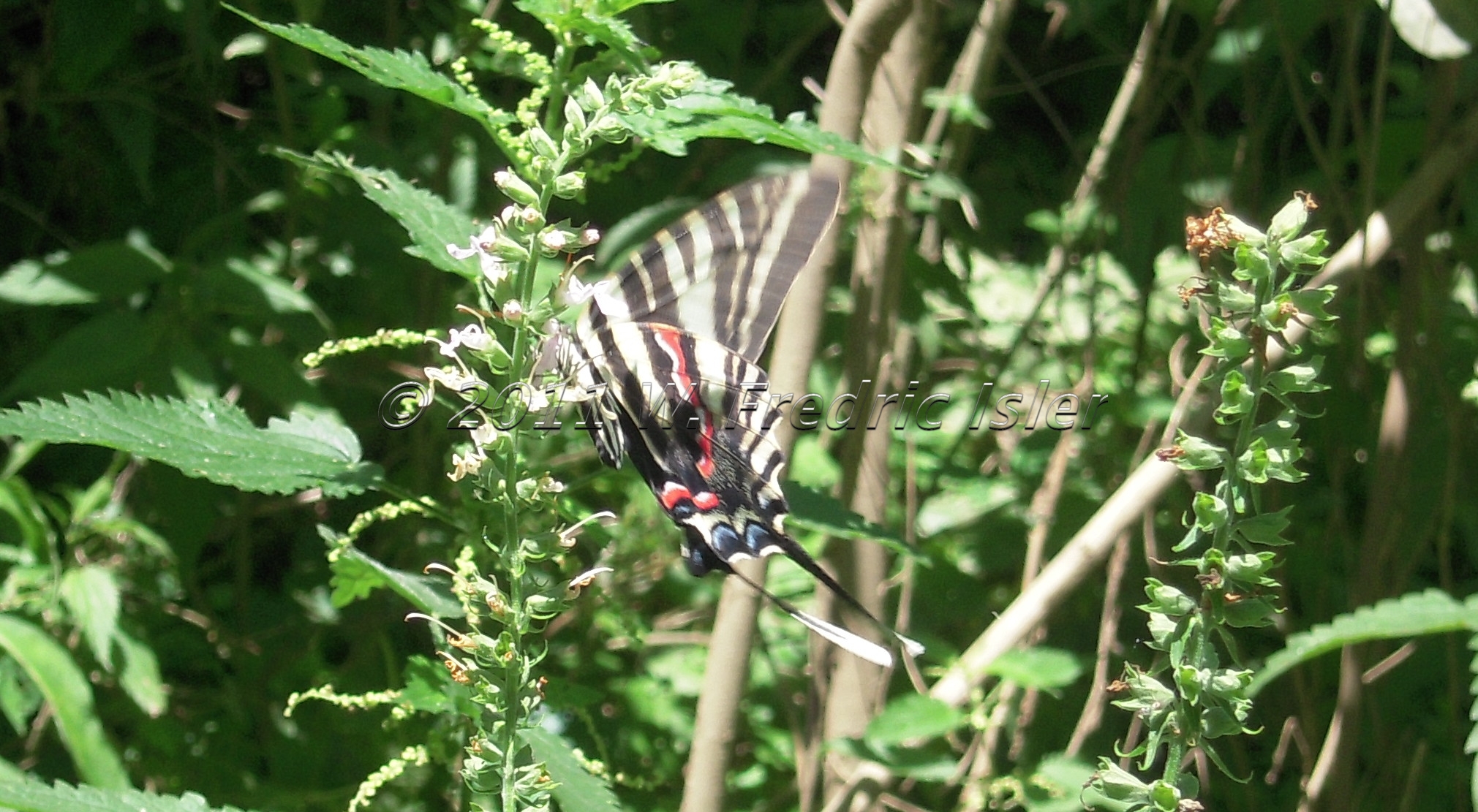 Trees sheltered us from the blazing sun as we moved eastward but once in awhile we’d step into a sunny opening. One of the last before we reached the eastern tip of the island was a butterfly feeding ground filled with beautiful swallowtails moving deliberately from flower to flower. I wasn’t sure what species they were so I took a few pictures. Later I discovered they were zebra swallowtails, whose caterpillars feed only on the leaves of pawpaw trees. Reading about and looking at photos of pawpaws solved an earlier mystery for us; we’d emerged from Hemlock Overlook Regional Park some weeks earlier unable to identify this same tree. Now we know zebra swallowtails and pawpaws when we see them, and we know where zebra swallowtails feed in summer pawpaw trees are never far away. Every moment spent in these beautiful spaces reveals more and more wonder.