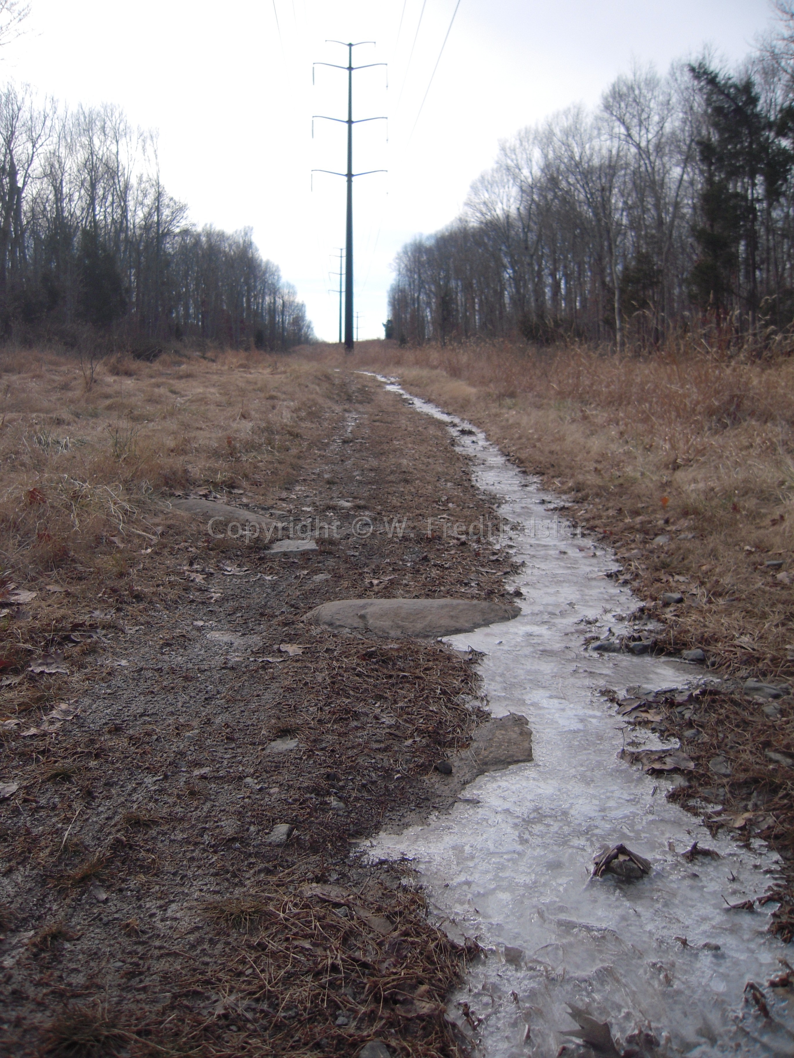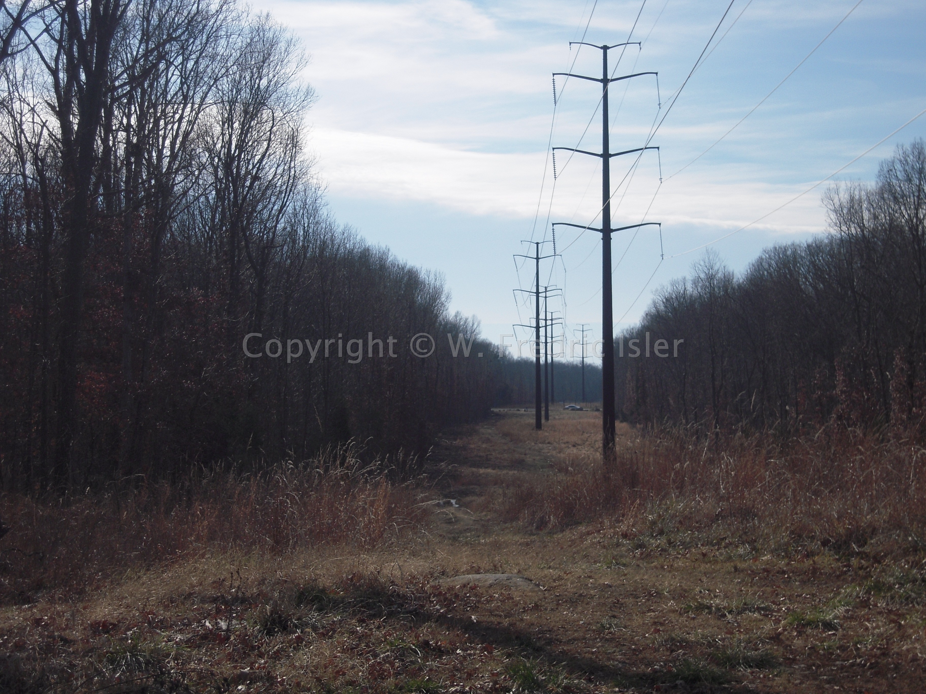 Monday afternoon I walked frozen ground under power lines from Pleasant Valley Road down to Elk Lick Run in Search of Vteam’s “Confluence!” (GCTVK3). Martin Luther King, Jr. Day was even colder than Sunday had been with a bit more cloud covering the low-hanging sun. Deer flowed south under the towers as I made my way down and east to the stream.