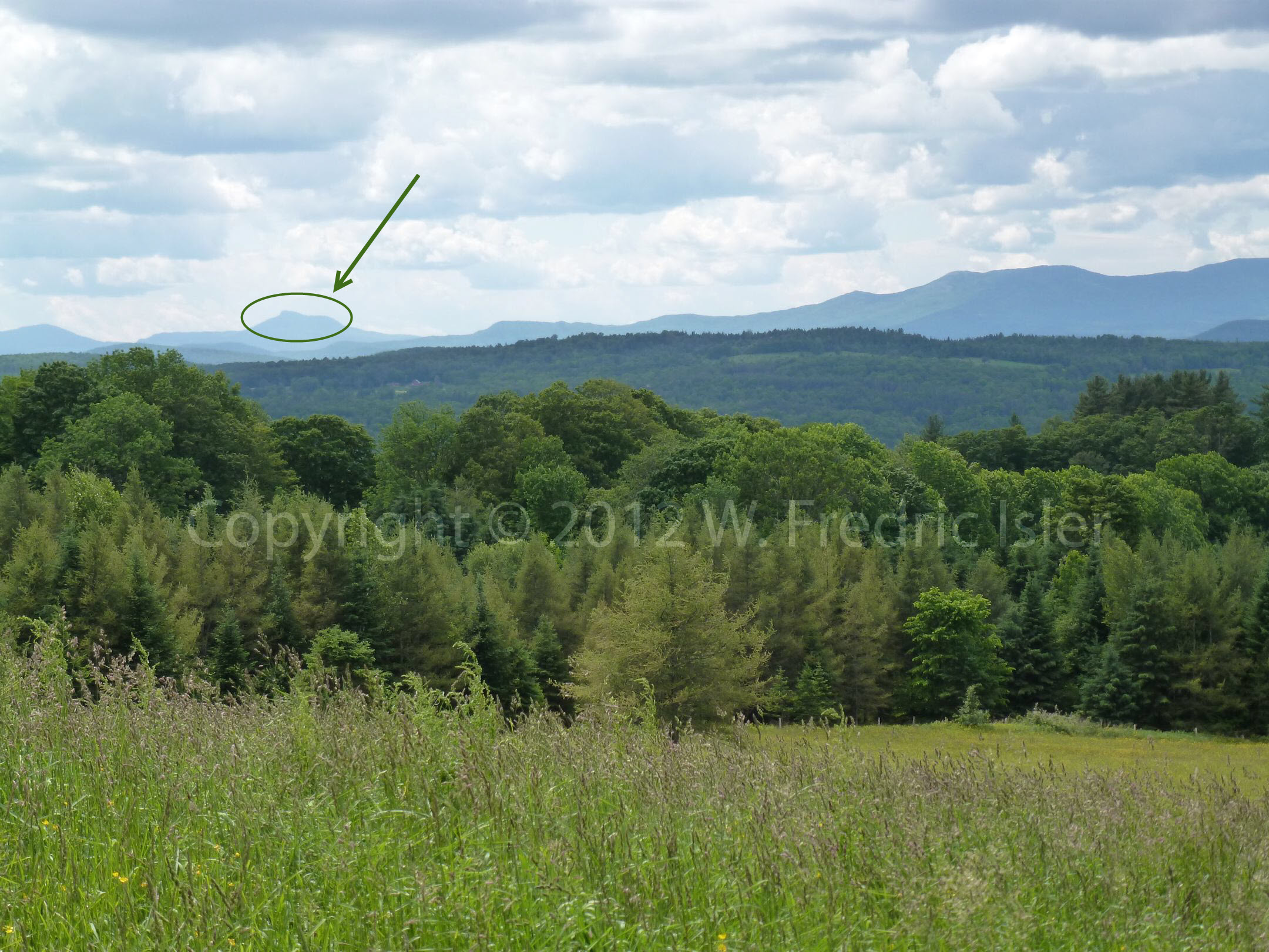 This is the most distant view of Camels Hump that I have discovered, but I would welcome information about more distant views…from this vantage point and above, you will see a magnificent panorama of the Green Mountains, including Camels Hump, of course, from a high meadow of the type that we once had in abundance in Vermont.