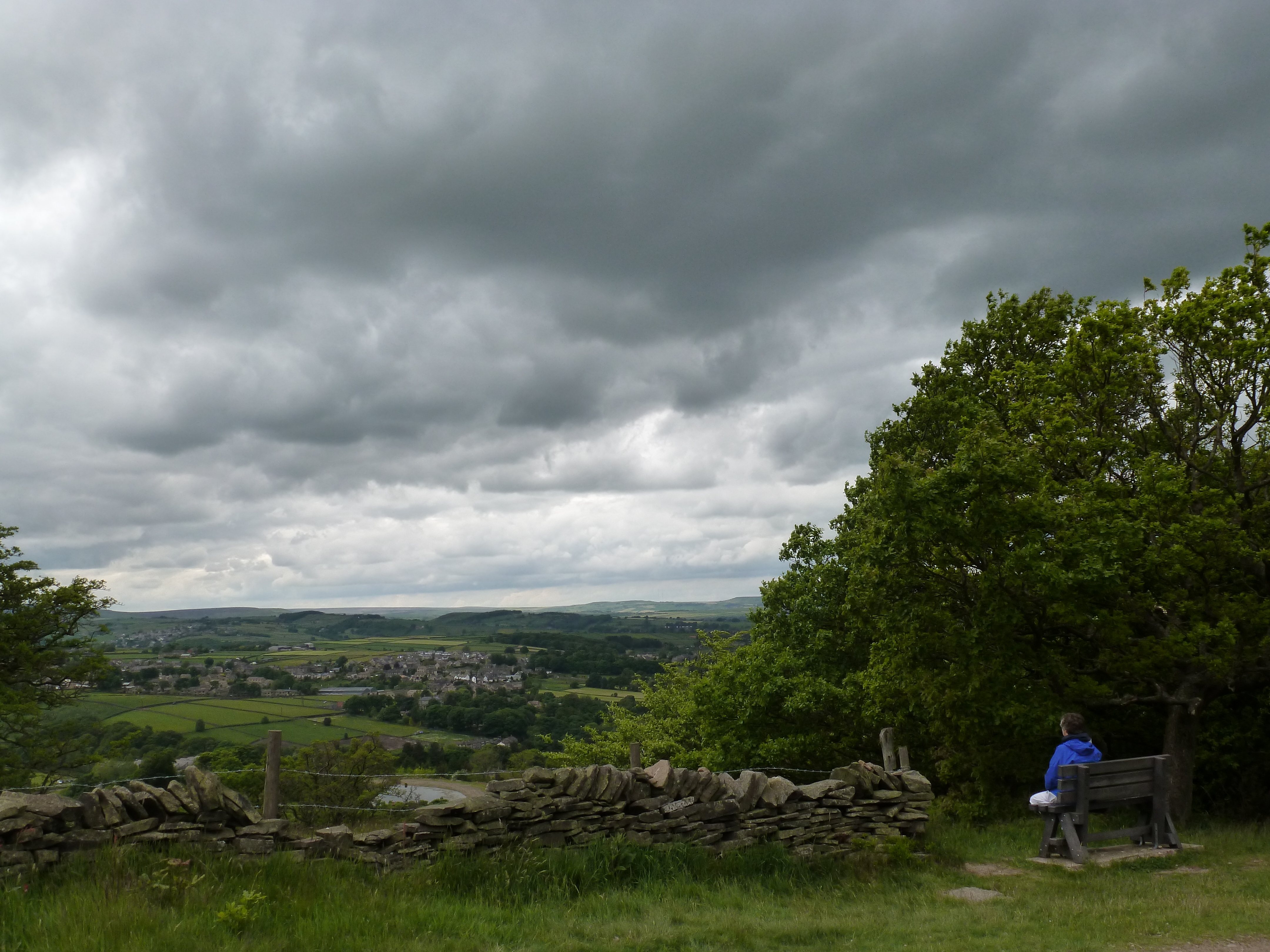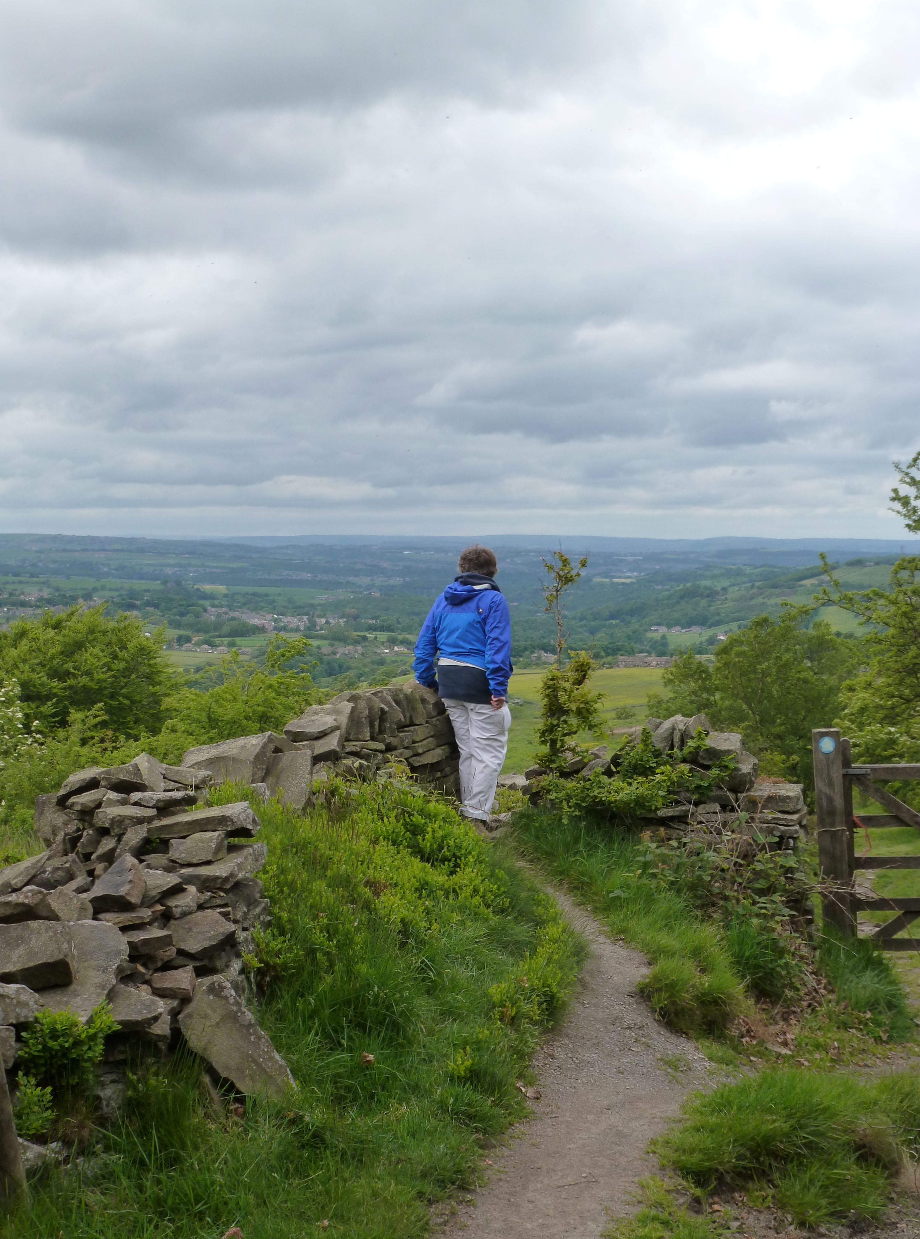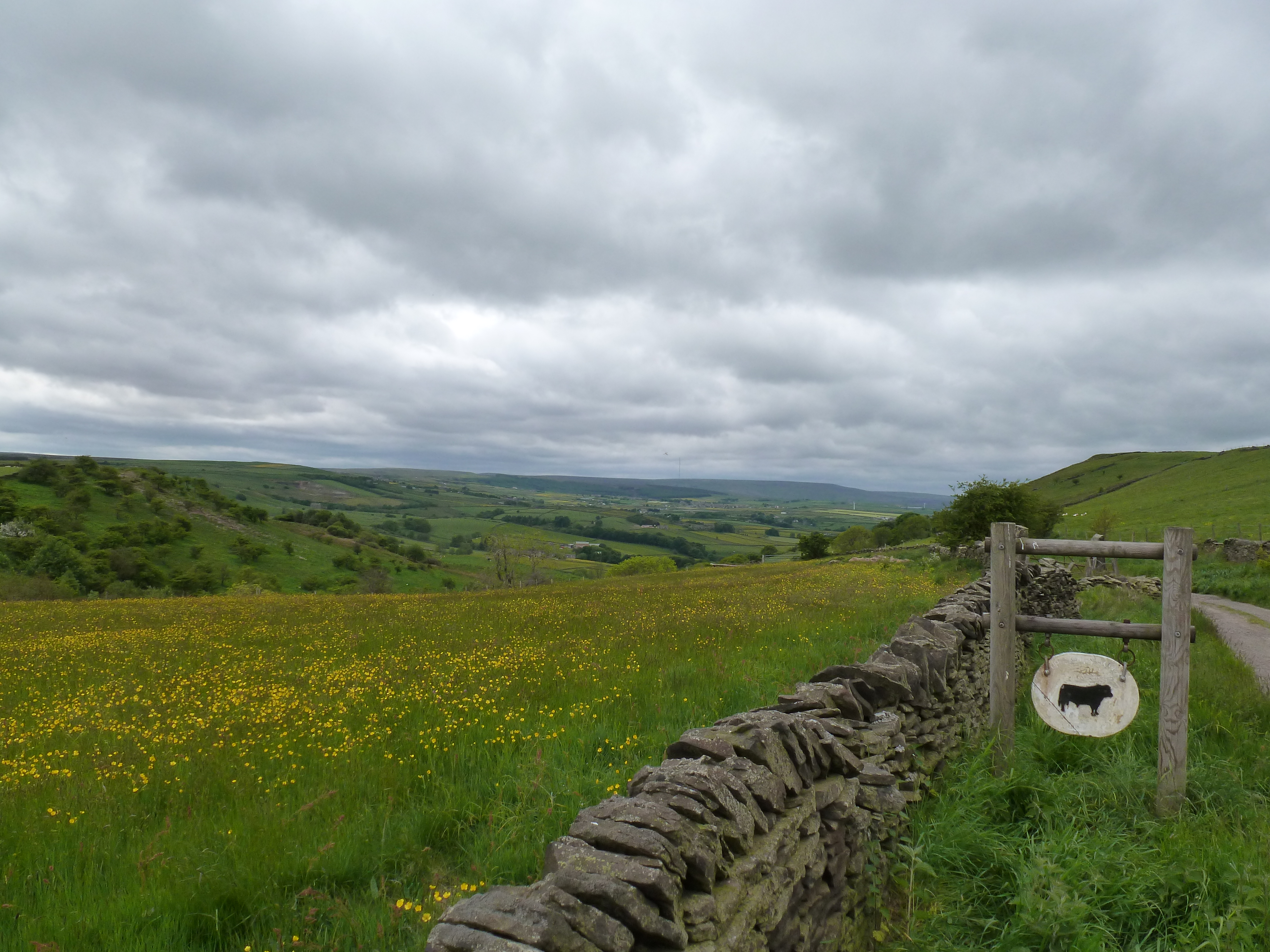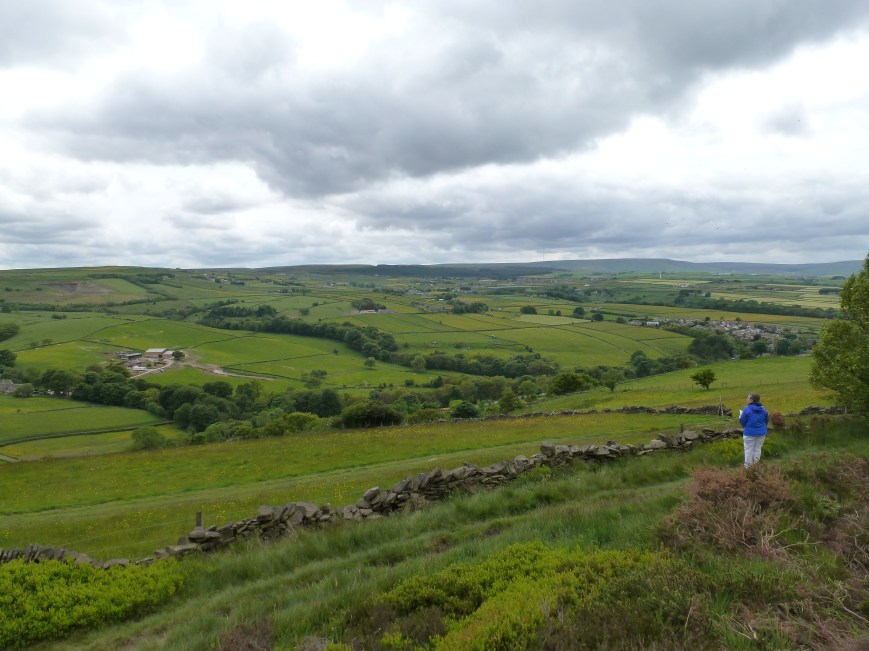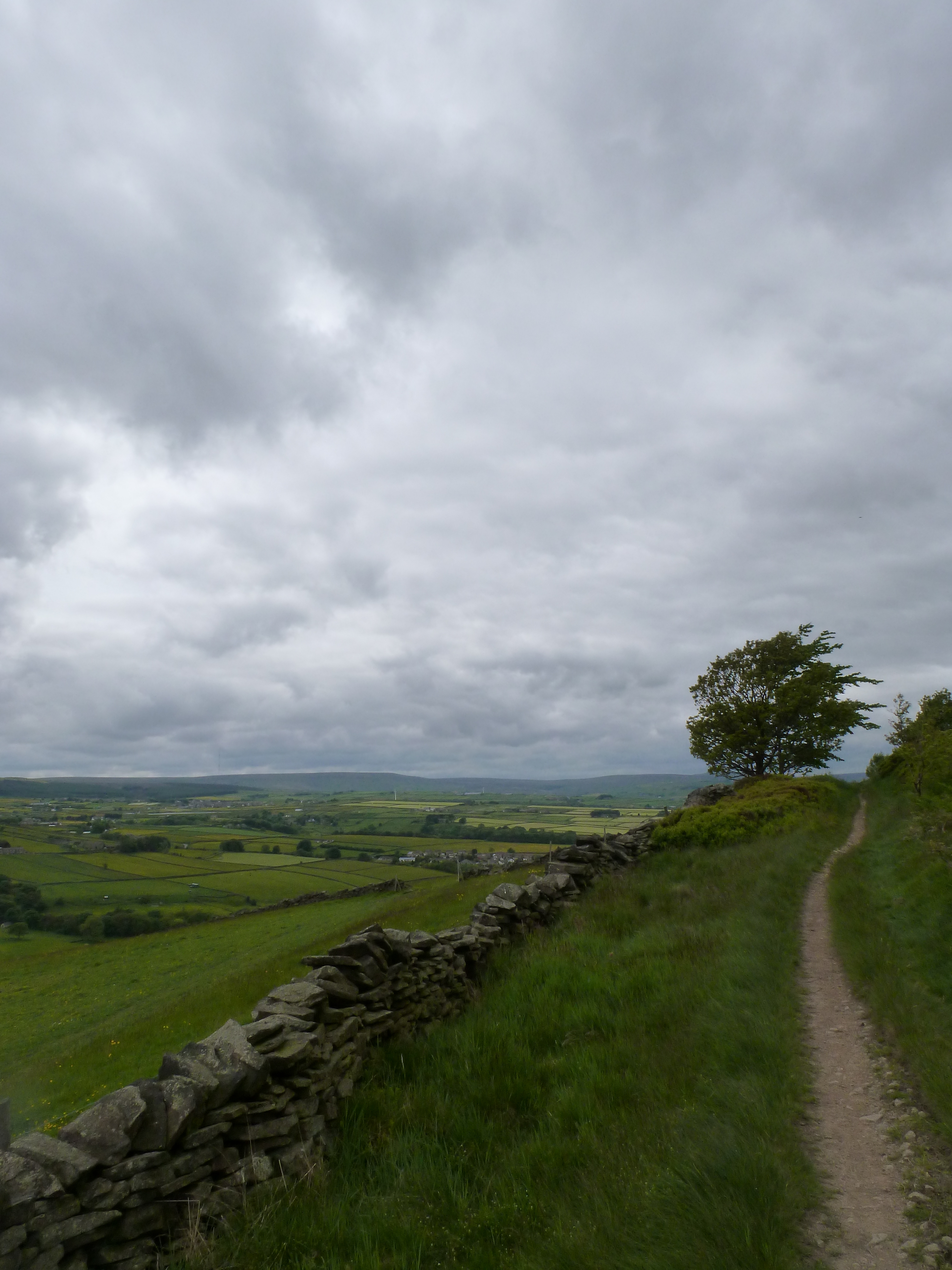 The skies were low and heavy on the afternoon of the 12th as we borrowed Sam’s copy of “Circular Walks in the Holme Valley” and drove to author F.C. Green’s suggested start point. For the first time since our arrival on 7 June we actually wore rain gear, just in case. We’d already spent four straight warm days in brilliant sunshine and thus were fully prepared for northern UK June weather to resume normal service.